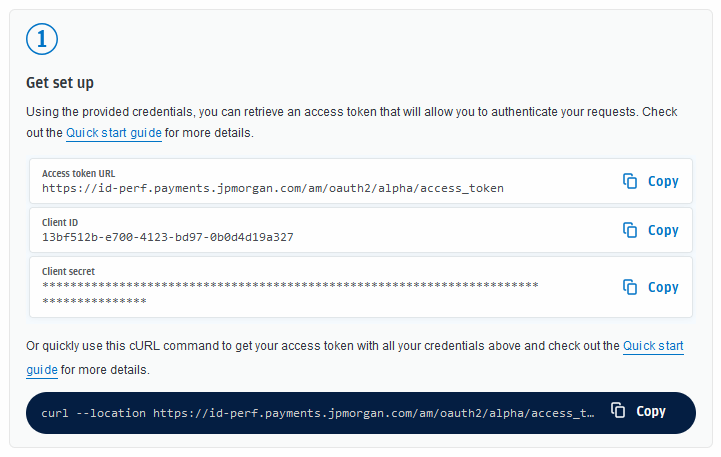 <client_id>: Your Client ID<Secret>: Your Client Secret- The URL (https://id.payments.jpmorgan.com/am/oauth2/alpha/access_token) should match the Access Token URL provided for your environment.